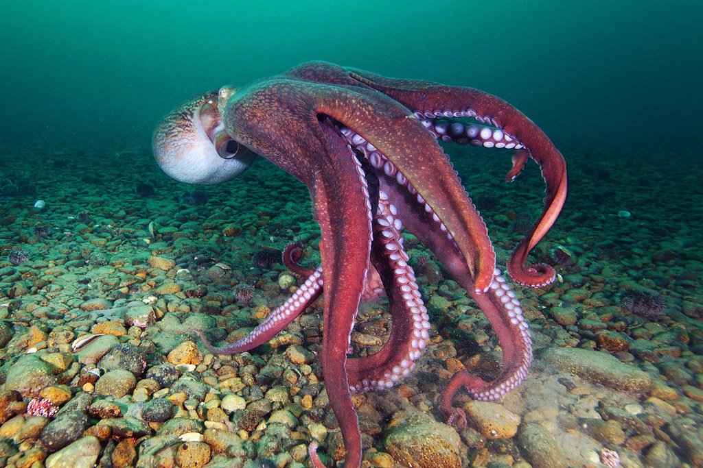 The Giant Pacific Octopus (Enteroctopus dofleini) is incredibly smart, capable of solving mazes and opening jars, but also has three hearts, blue blood (due to copper), and arms with their own mini-brains, allowing them to multitask; a female's life ends in selfless dedication as she starves to death guarding her massive egg clutch, from which only a few hatchlings survive, notes SeaDoc Society, OctoNation - The Largest Octopus Fan Club!, Hastings Aquarium, and explore . adventure . discover.